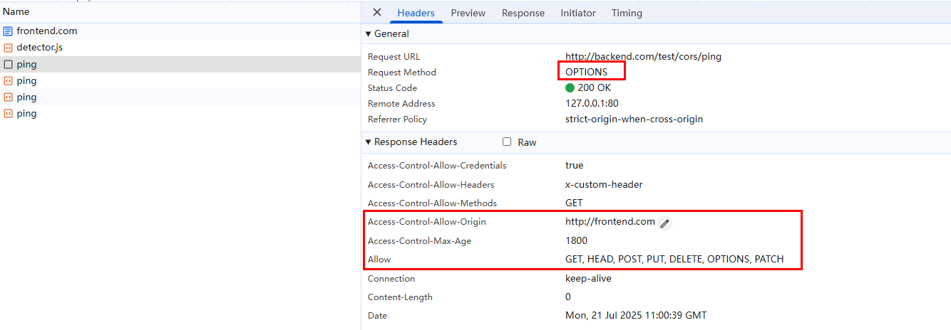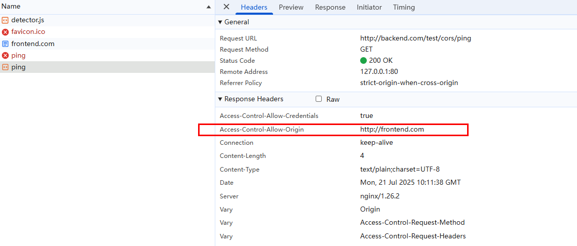 前端再次访问,就可以访问成功了。我们可以看到在 response header 中,明确的指出了 http://frontend.com 这个地址:
